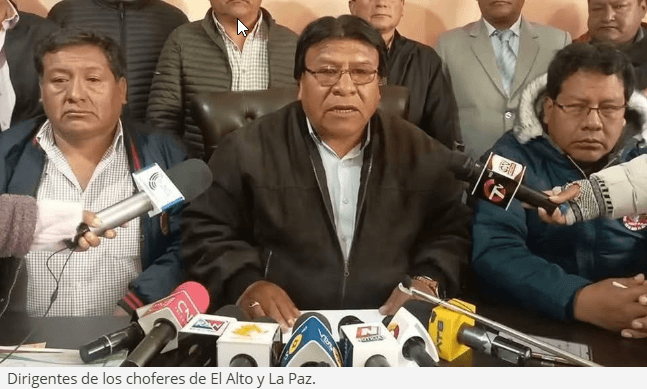 “Por determinación del ampliado departamental, nuestras ocho federaciones regionales del departamento de La Paz, han decidido ir a un paro de 48 horas; a partir del día lunes y martes. Si el Gobierno no hace caso a las peticiones de la federación del departamento de La Paz iremos a un paro indefinido desde el lunes 31 (de marzo)”, advirtió el secretario ejecutivo de la Federación Departamental de Choferes 1 de Mayo de La Paz, Edson Valdez.