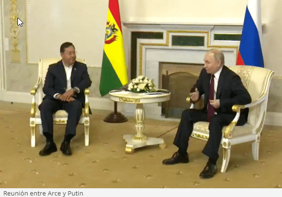 “Tenemos muchos proyectos interesantes y objetivos planeados como prioritarios planteados con el liderazgo anterior de su país. Usted continúa con la tradición y tenemos muchos temas de que hablar”, le dijo Putin a Arce en el Palacio Konstantinovskly, en San Petersburgo.